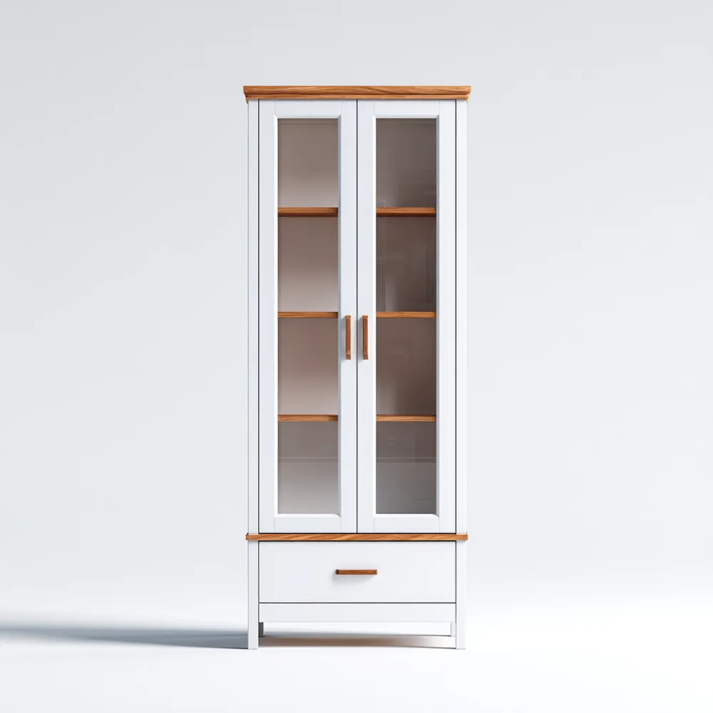 Funktionale HighlightsDer Schrank bietet großzügigen Stauraum mit mehreren Einlegeböden und einer unteren Schublade, ideal zur Aufbewahrung und Präsentation von Dekoartikeln.