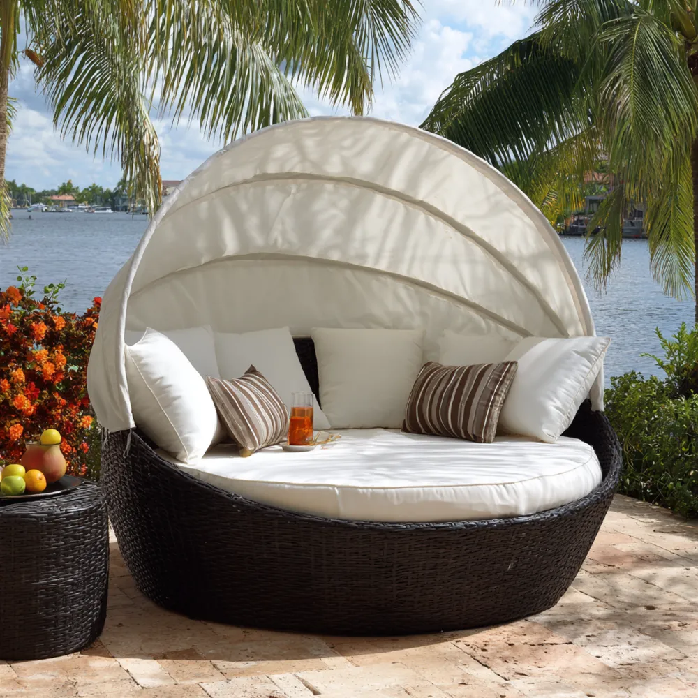 Funktionale HighlightsMit einem integrierten Sonnenschutz ausgestattet, bietet diese Rundliege optimalen Schatten und Schutz vor UV-Strahlen. Die großzügige Liegefläche garantiert Entspannung für mehrere Personen.