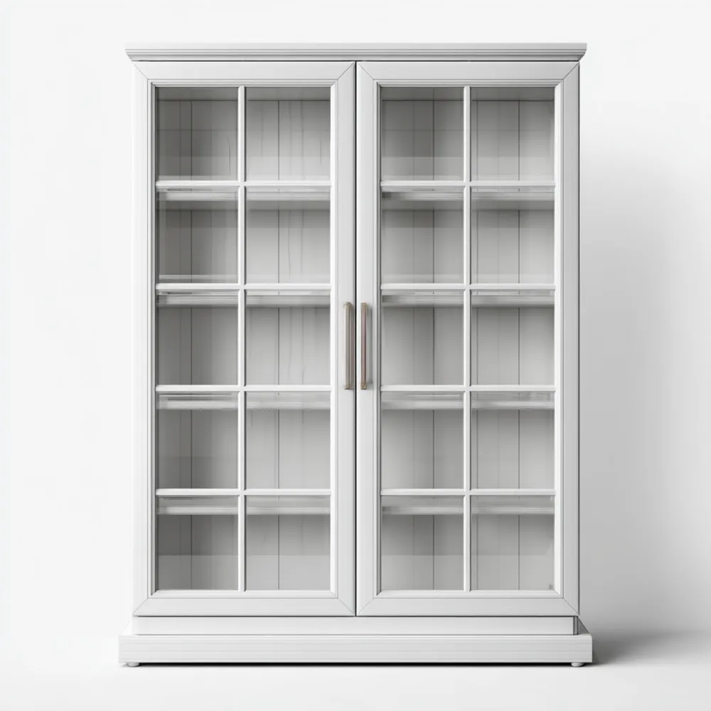 Der Schrank besteht aus robustem Holz mit einer eleganten weißen Lackierung. Die Glastüren verleihen ihm ein klassisches Aussehen und machen den Inhalt auf einen Blick sichtbar.
